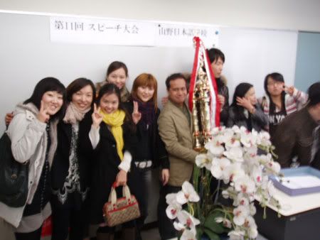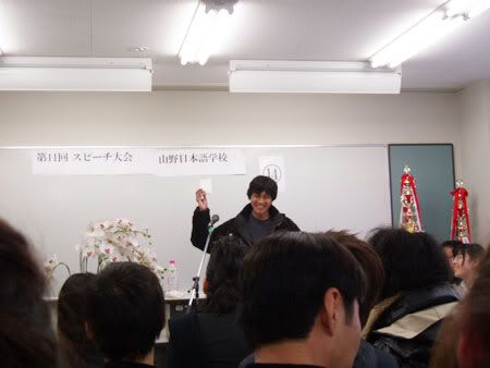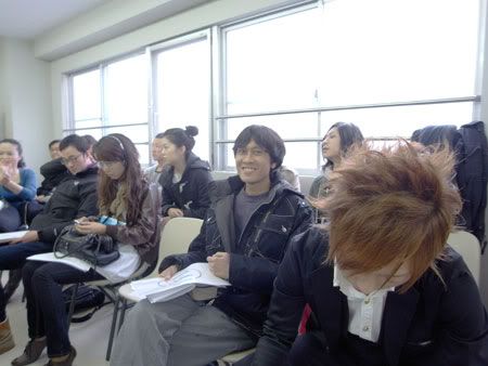 After that, we had to give our 3-minute speech to the class. Two representatives were chosen by classmates of each class. I was among the chosen ones. Oooh, the chosen ones.For every participant, there is a classmate to introduce him/her before the speech. This is my, uh, "introducer". Hemmin-san from Korea. Pretty, smart and a handy-man (handy-girl?). Bring some materials to her and she'll cook up a beautiful necklace or bracelet. Looks like the real thing in shops, I swear!
