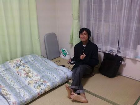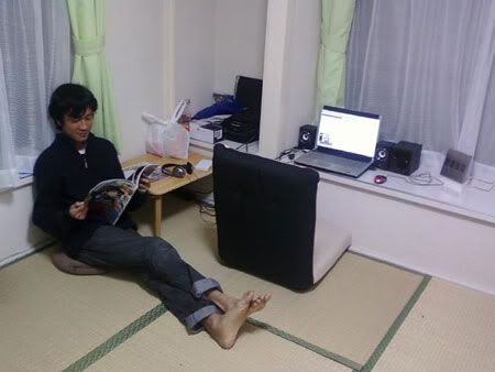 Anyhow, being the anime and Internet addict that I am, I came over to Dzaid's house to blog and watch some nice *cough*downloaded*cough* anime. His room is real nice and comfy, and very Japanese. Let me show you around. Here he is enjoying his brand-spanking new PSP-3000. Unlike my room, his floor has cool tatami mats, so not much furniture is needed. You can't see it, but the access to this room and to the house itself are by wooden sliding doors. Very Japanese!